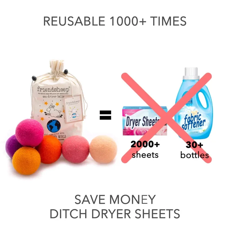 Friendsheep Eco Dryer Balls zijn een volledig natuurlijke en biologische wasverzachter, handgemaakt van 100% premium Nieuw-Zeelandse wol. Ze vervangen chemisch behandelde plastic droogvellen voor eenmalig gebruik en wasverzachters die schadelijke chemicaliën bevatten, zijn volledig herbruikbaar voor meer dan 1000 wasbeurten en verkorten de droogtijd tot wel 40%!