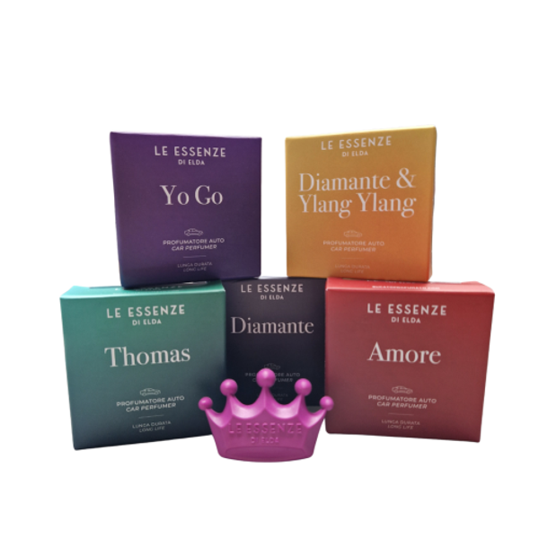 Denk nu eens aan de binnenkant van uw auto, altijd geurig en fris. Dit is het effect dat je kunt bereiken met de autoluchtverfrissers van Le Essenze di Elda, verkrijgbaar in een mooie kroonvorm en in verschillende geuren, zodat je de omgeving van je auto kunt personaliseren met je favoriete parfum.