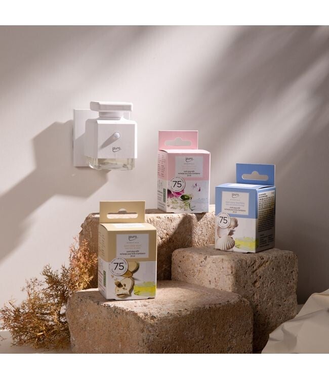 Essentials Plug-in vult de kamers met uw favoriete geur met behulp van een ingebouwde bewegingssensor en omgevingslicht. De geurintensiteit kan naar wens worden gevarieerd tussen 3 niveaus.
