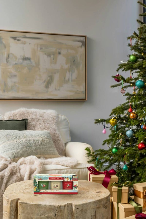 Haal de kerstsfeer in huis met deze charmant verpakte set van drie Tumbler Candles.