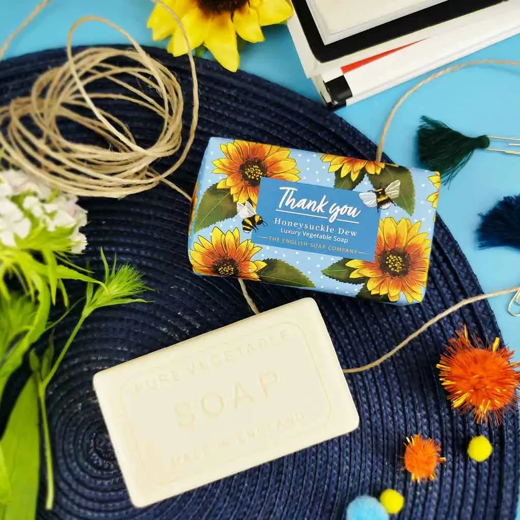 De Honeysuckle Dew - Thank You zeep is geparfumeerd met zoete tonen van kamperfoelie en waterlelie, met subtiele tinten van citrus en oranjebloesem. Prachtige bijen zoemen over, samen met de hand geïllustreerde zonnebloemen op deze prachtige papieren verpakking.