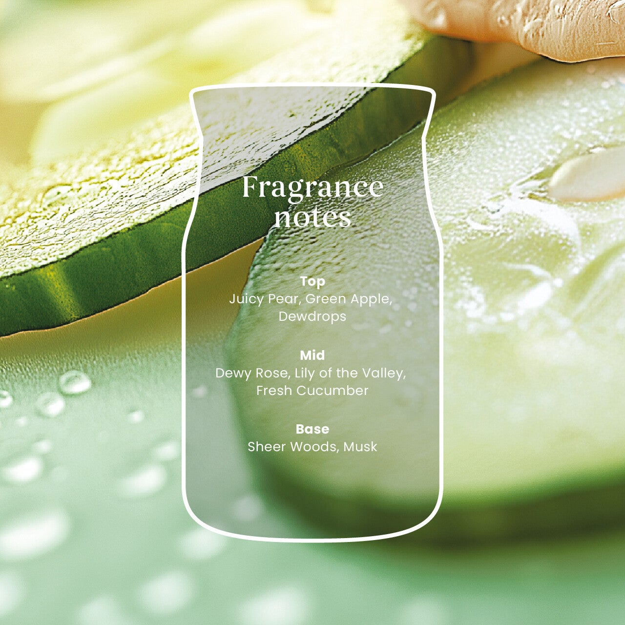 Een verslavende geur van een bloemenboeket, perfect aangevuld met fruit, waardoor je helemaal wegzwijmelt. Tonen van sappige peer en verse komkommer vermengen zich zoet met dauwfrisse roos.